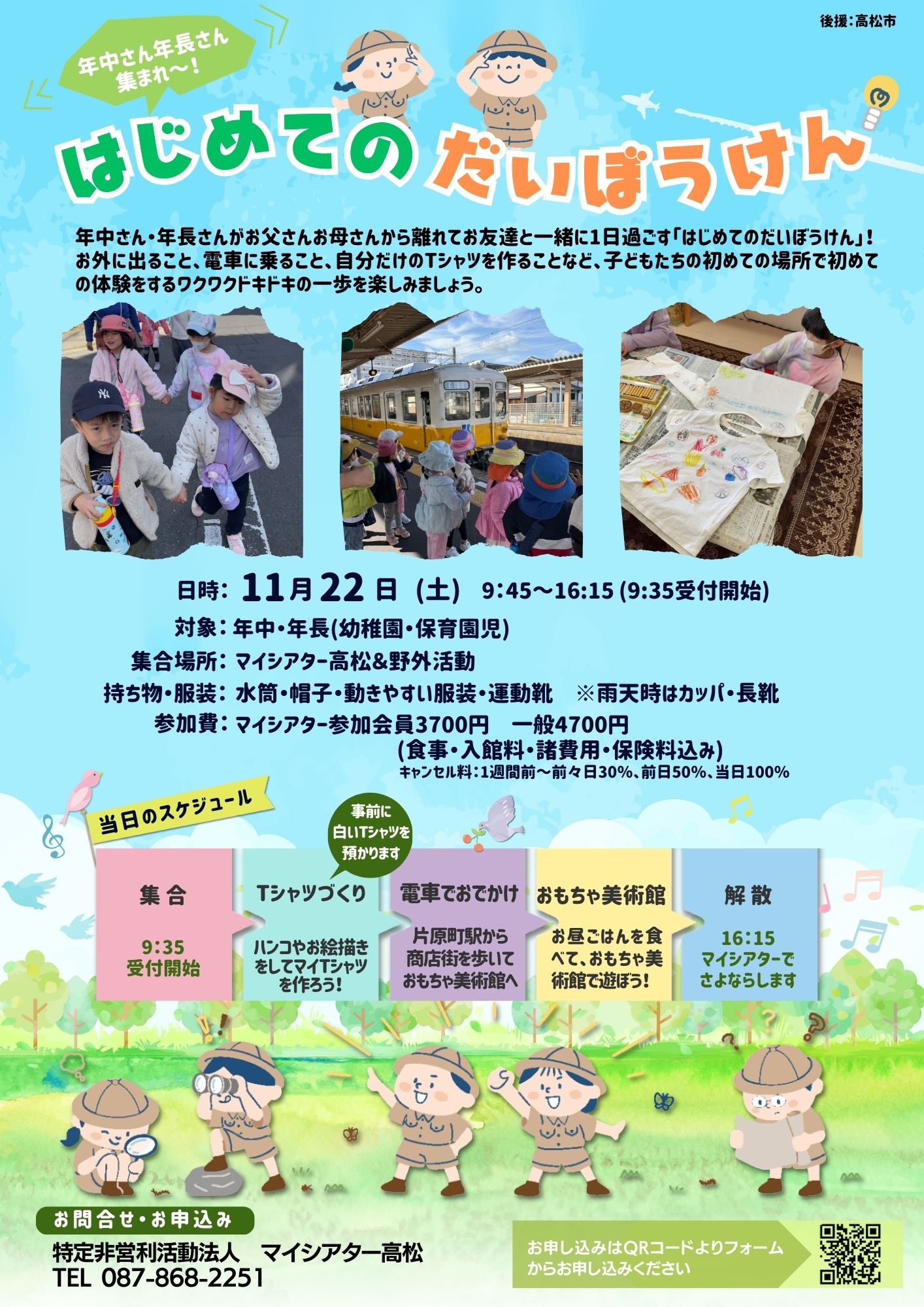 今日のくりりんくらぶは、おやつを持って公園に遠足に行く予定でしたが、雨天の為、マイシアターの2階での室内遊びに変更して遊びました。