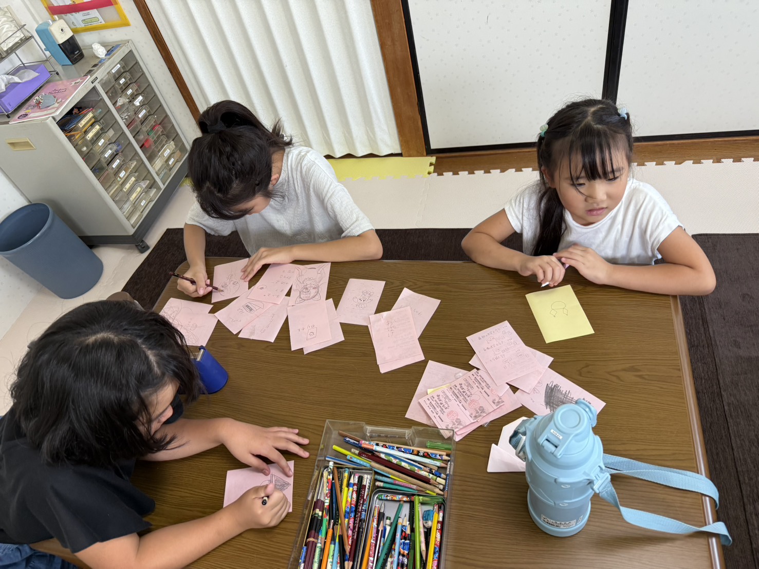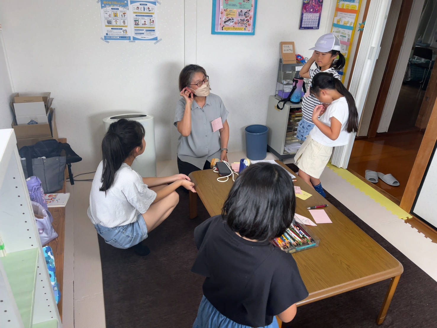 本人に見えないように書いてもらい、皆んなに質問して、答えてもらいながらそれをヒントに自分で私が誰かを答えるゲームです。皆んな順番に答えました。