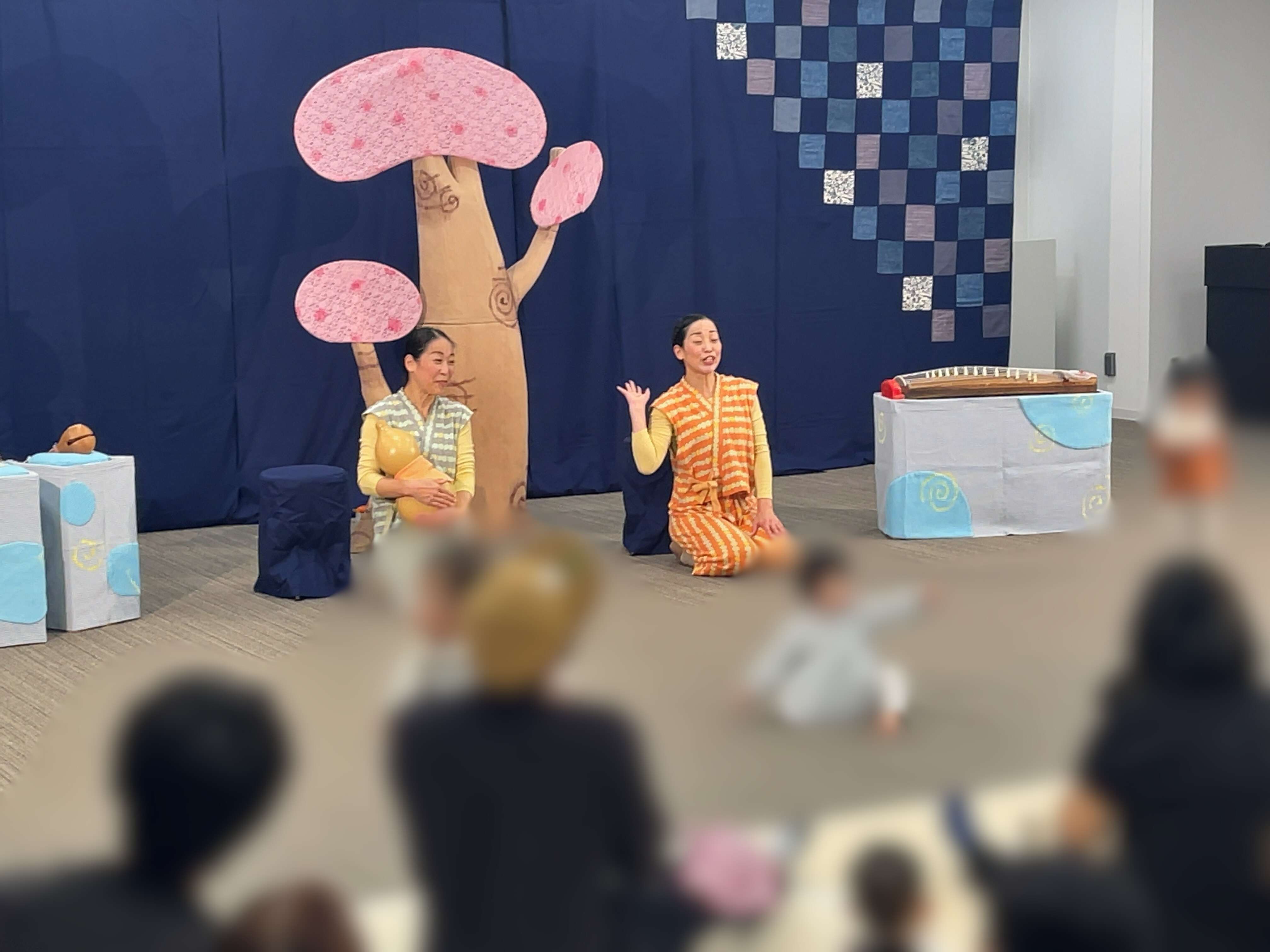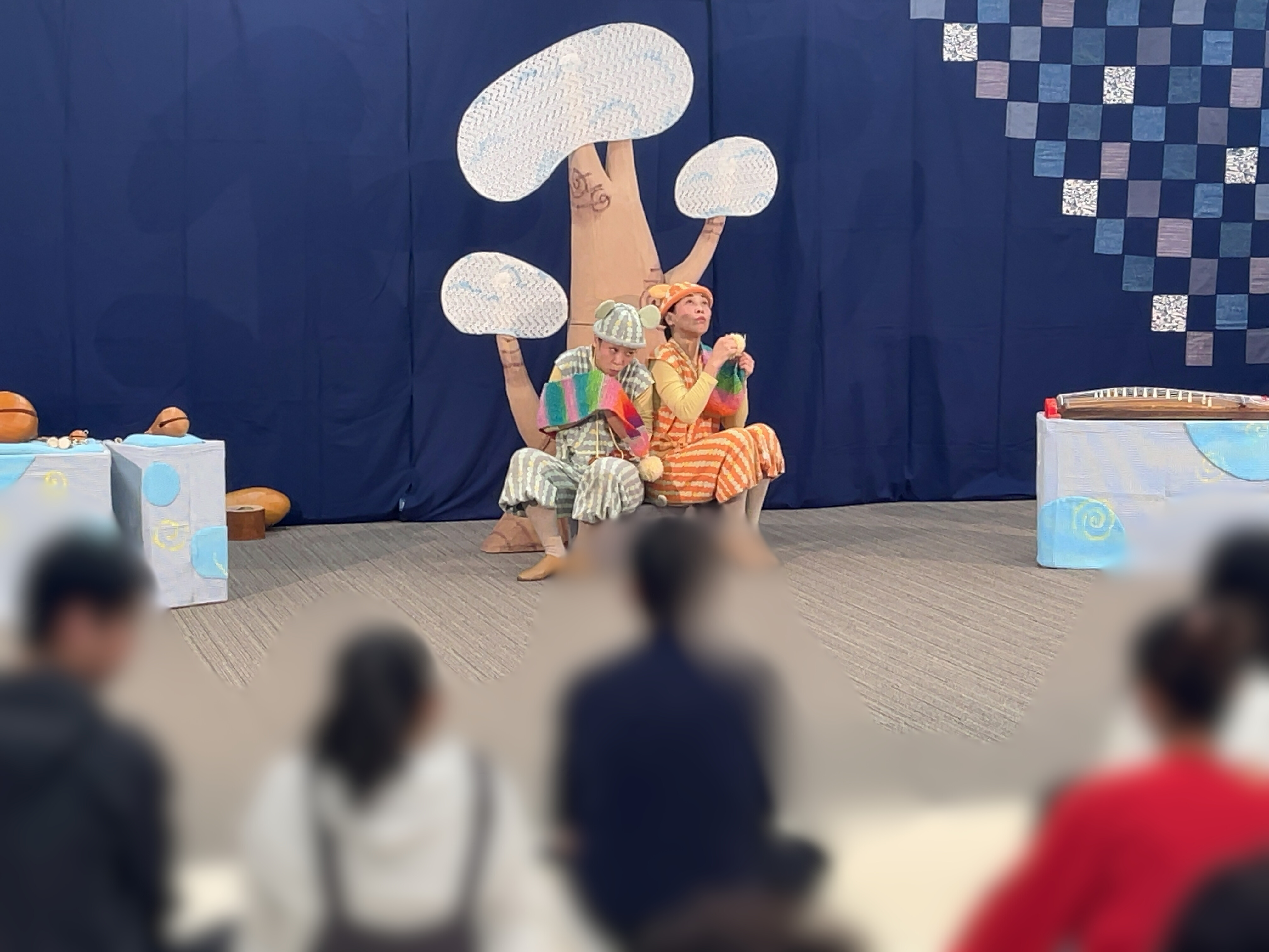 ネズミさんとねこさんの掛け合いも楽しいのですが、気を彩る季節の色彩の変わり方や、お琴や三味線、木魚など日本の和楽器での演奏も間で流れ、パッと目を引く色の変化や耳慣れないながらも懐かしい音に親子で目線が舞台にくぎ付けでした。