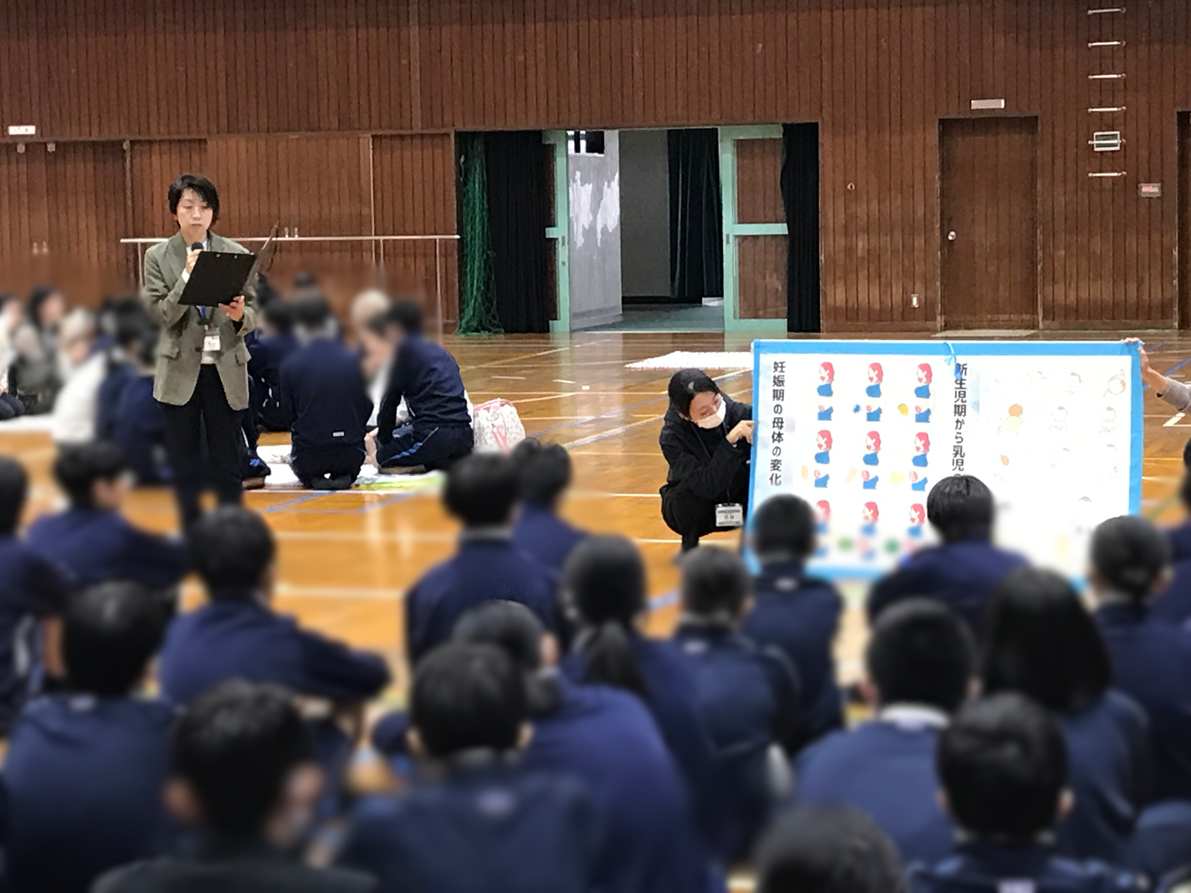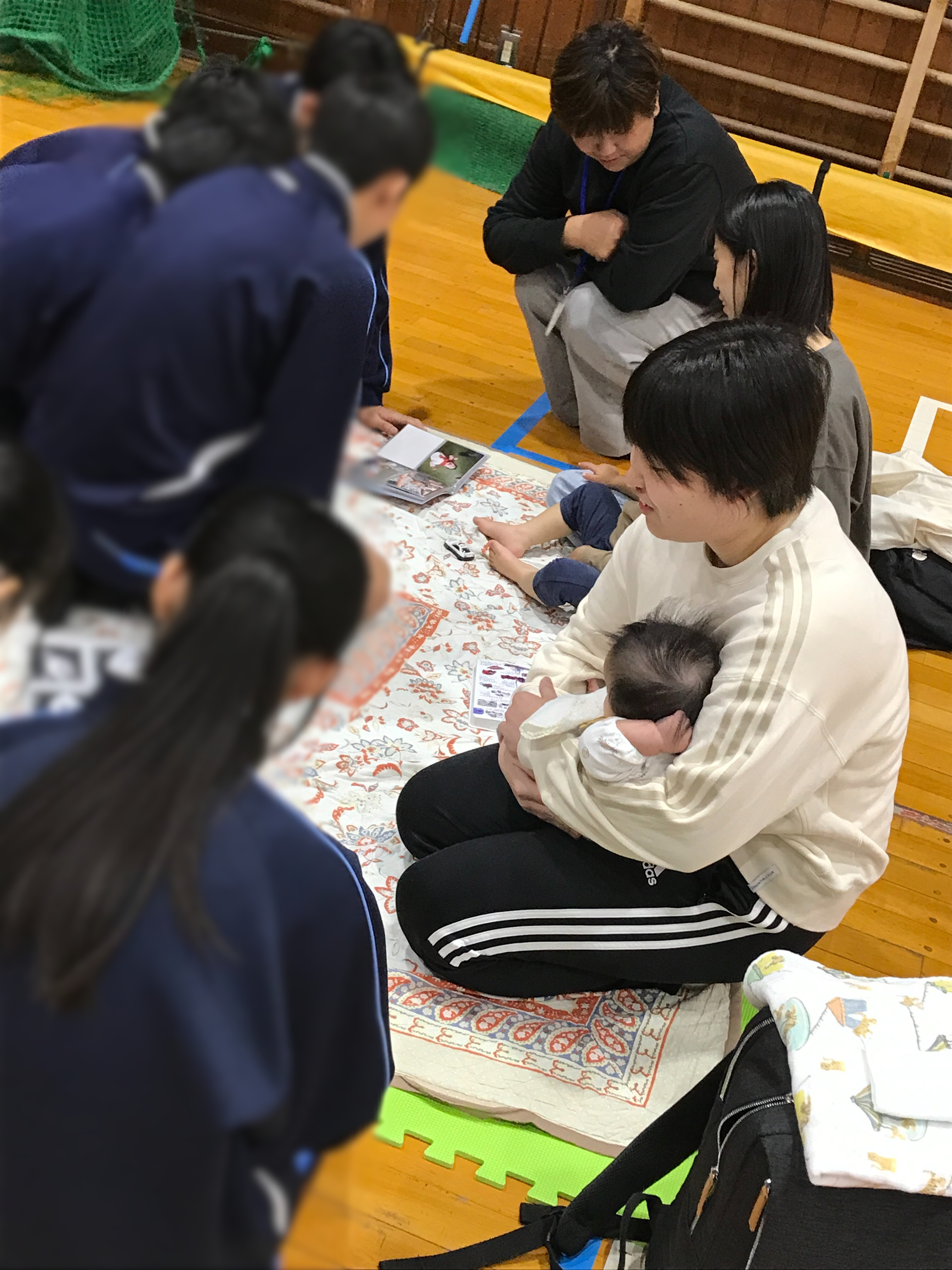 乳幼児親子さんと中学3年生の生徒の皆さんに実際に触れ合ったり、妊婦ジャケットを使った妊婦体験や赤ちゃん人形を使ってのお世話体験をしてもらいました。
